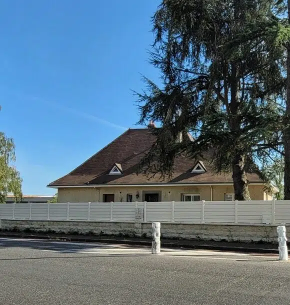 Nous sommes fiers de vous présenter ce projet : une clôture en PVC beige, avec des lisses inclinées, de type brise-vue, installée sur un muret.